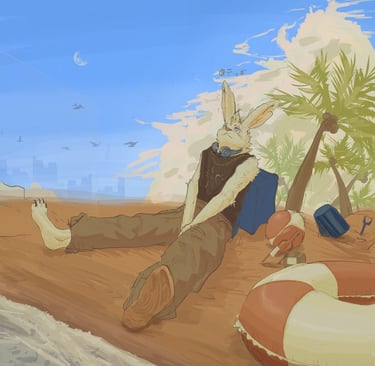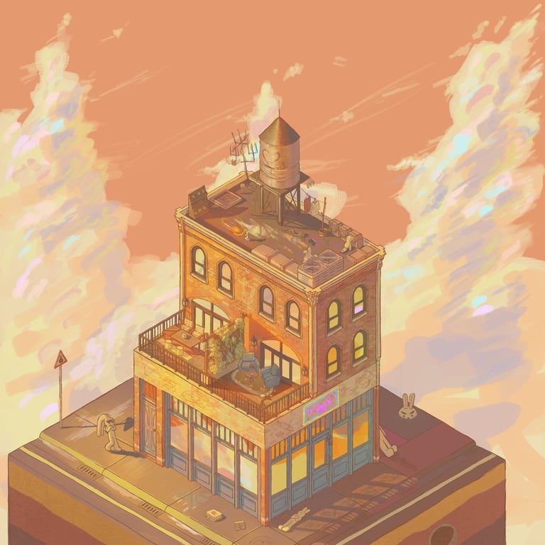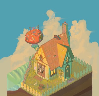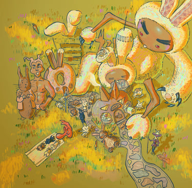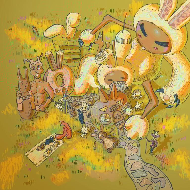 The ehibition will be constitutted with 2 parts: The Cottage and The Bunny town. The Cottage will be with the Cottage drawing in center and three drawing showing the life of the owner of the cittage and the Bunny town will be one Bunny Building in the center and 3 pieces of drawing showing the bunnies.